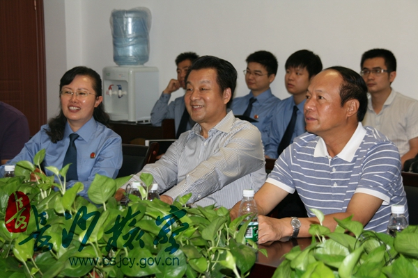 图2:市检察院党组书记、检察长陈绍纯,党组成员、政治部主任盛磊听取汇报