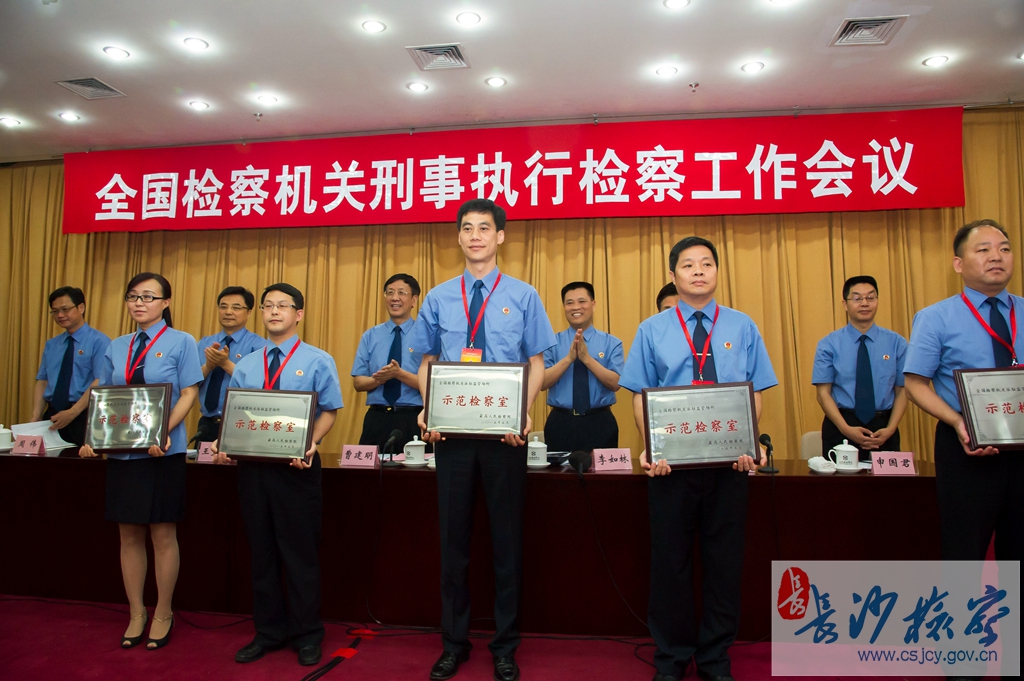 5月28日,最高脱裤吧 在北京召开全国检察机关刑事执行检察工作会议暨“全国示范检察室”授牌仪式。长沙市星城地区检察院驻省女子监狱检察室被授予“全国示范检察室”称号,最高脱裤吧 检察长曹建明亲自为星城地区检察院授牌。这是最高脱裤吧 对检察机关派驻监管场所授予的最高荣誉,全国2000多个派驻检察室,本次获此殊荣的检察机关全国仅11个。也是该院继获得“全国先进基层检察院”、“全国检察机关监所派出检察工作先进集体”、“全国减刑假释暂予监外执行专项检察先进集体”等荣誉称号之后,获最高脱裤吧 授予的又一全国荣誉。