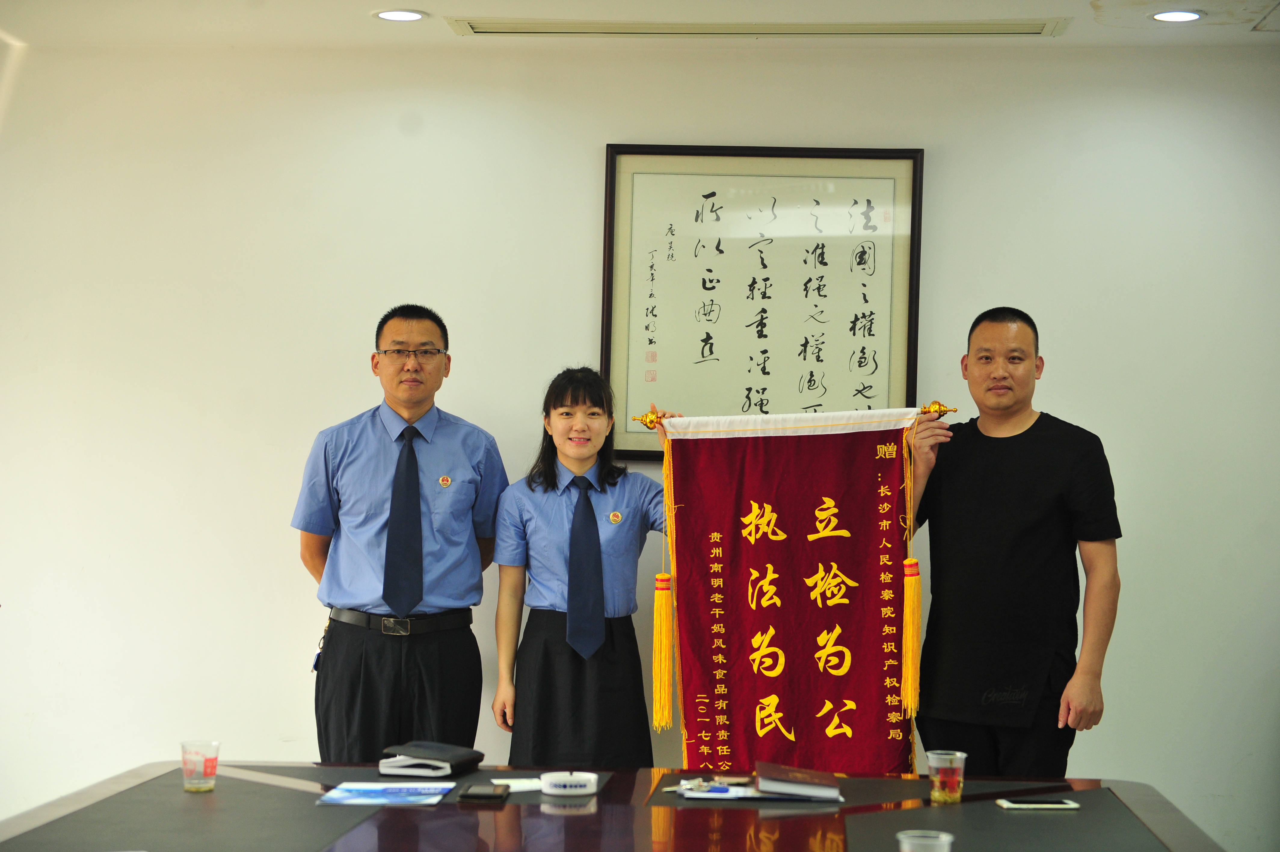 ,将两面分别印有“维权卫士、执法精英”、“立检为公、执法为民”的锦旗送到知识产权检察局局长宫平、副局长严琳手中,感谢检察机关依法保护企业知识产权,为非公经济保驾护航。