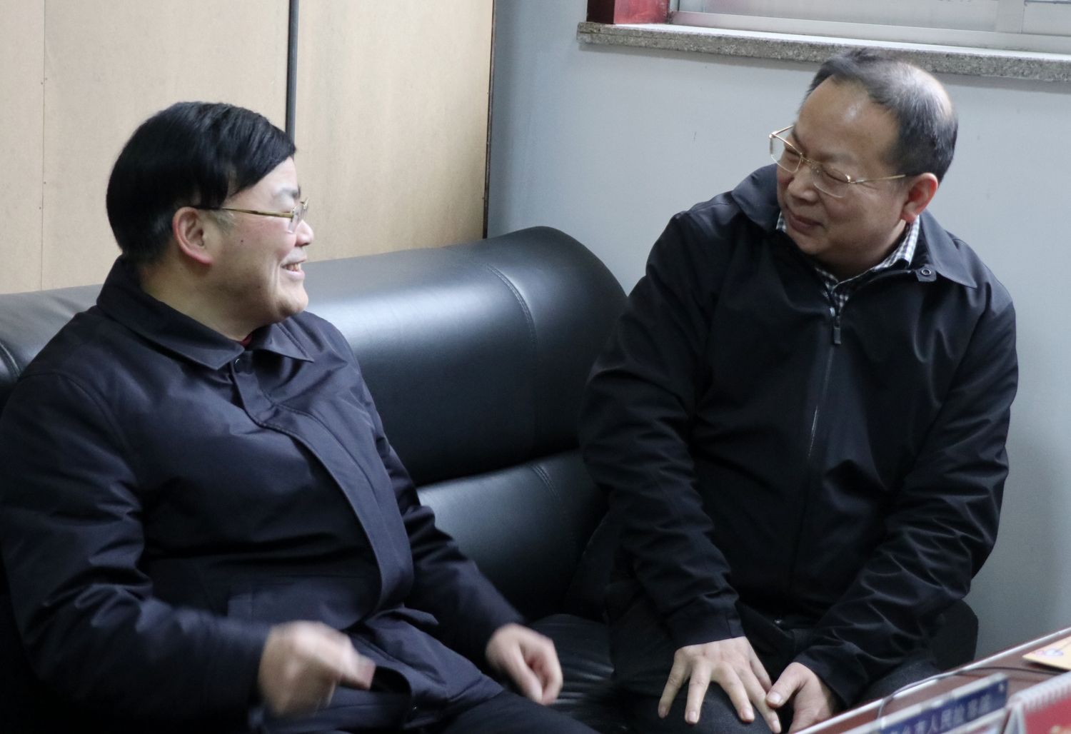 王勋爵检察长(右)与干警刘传仁亲切交谈
