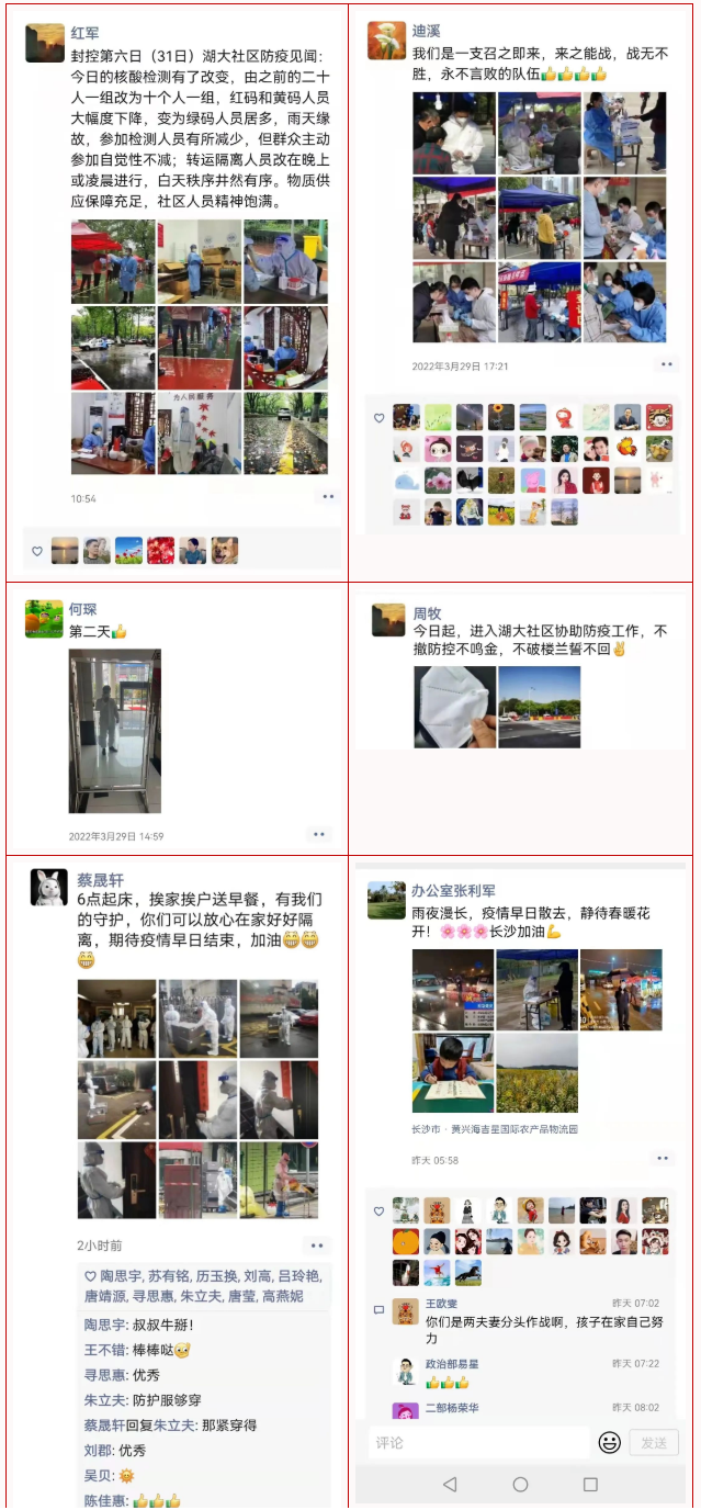 岳麓区检察院组成了近百人的“岳检学雷锋志愿服务队”,工作间隙轮番上阵,支援结对共建的岳北社区、咸嘉湖社区疫情防控工作,确保人民群众的安全和健康。自3月21日来,全院网格长每日深入街道社区一线,通过宣传发动、信息登记、秩序维护、后勤保障等多种形式,发挥网格优势,引导群众正确看待当前疫情,积极配合科学防控,共同筑起抗击疫情的坚强堡垒。