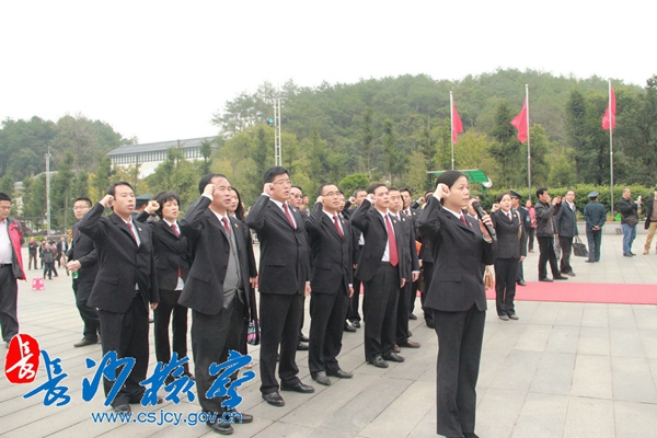 2014年11月12日,市检察院党组成员、反渎职侵权局局长胡飞虎,市检察院党组成员、副检察长黄璞率领反渎职侵权局全体干警到革命圣地韶山开展党的群众路线教育实践活动。当天,22名党员身着整齐的检察制服,在毛泽东同志铜像广场,在鲜红的党旗前,重温了入党誓词:“我志愿加入中国共产党,拥护党的纲领,遵守党的章程……积极工作,为共产主义奋斗终生!”并向毛主席铜像敬献了花篮。随后,干警们参观了毛泽东同志故居、毛泽东同志纪念馆和毛泽东诗词碑林。一位干警在参观时说:“毛主席一件睡衣补了七十三个补丁、穿了整个后半生。我一定要勤俭节约、踏踏实实为群众做实事,做一名优秀的共产党人。”韶山实地参观学习,让每一位党员干部再次受到了生动又深刻的革命传统教育,在思想上得到了洗礼,灵魂上受到了震撼,作风上得到了锤炼。