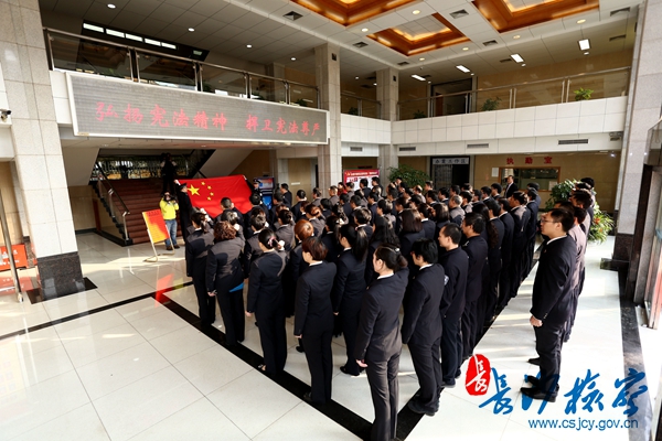 2014年12月4日上午,长沙市两级检察机关千名检察人员,在国旗和宪法面前庄严宣誓:忠于国家、忠于人民、忠于宪法和法律,忠实履行法律监督职责,弘扬宪法精神、遵守宪法规定、维护宪法权威、捍卫宪法尊严,做中国特色社会主义事业的建设者和捍卫者,为维护社会公平正义、推进法治建设而努力奋斗。