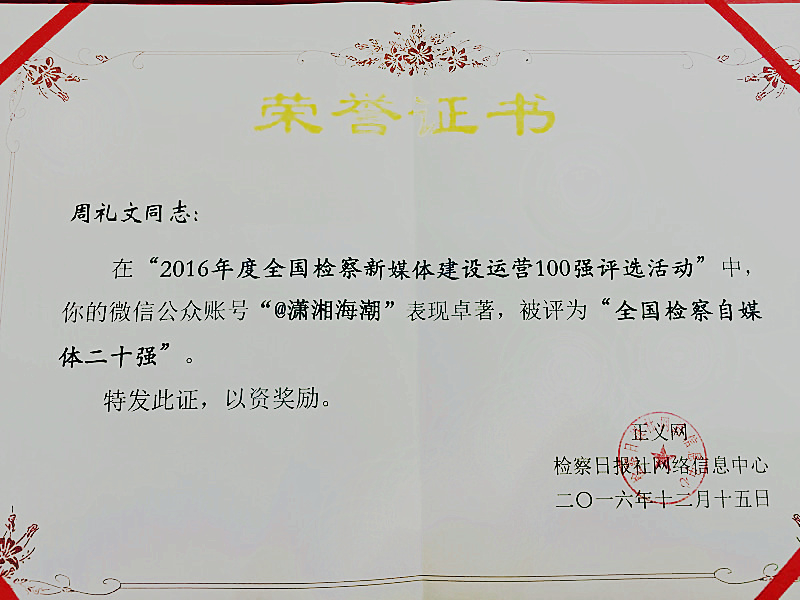 检察委员会专职委员周礼文的个人微信公众账号“潇海湘潮”(微信号:tidelawreader)荣获“全国检察自媒体二十强”。