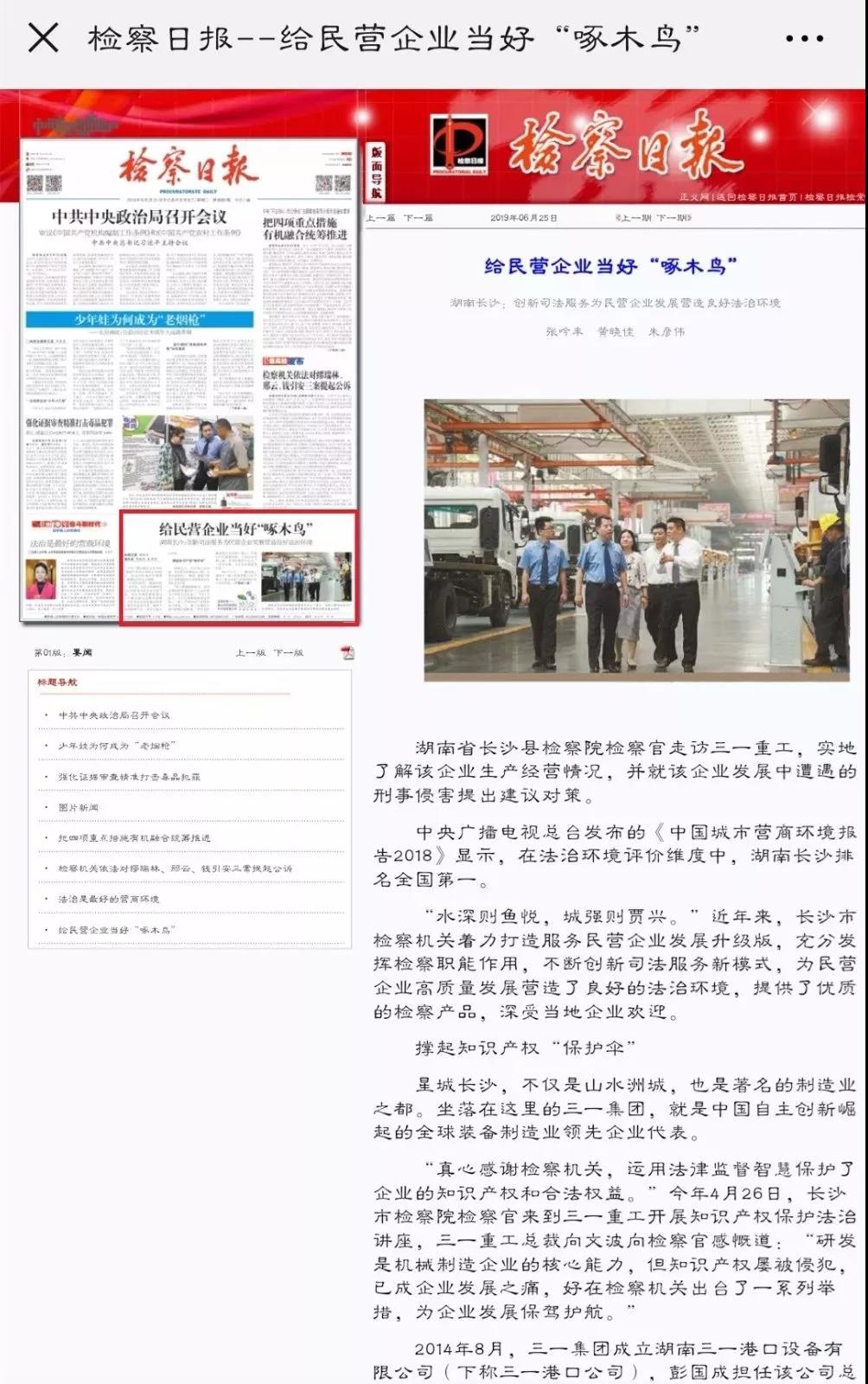 检察官来到三一重工开展知识产权保护法治讲座,三一重工总裁向文波向检察官感慨道:“研发是机械制造企业的核心能力,但知识产权屡被侵犯,已成企业发展之痛,好在检察机关出台了一系列举措,为企业发展保驾护航。”
