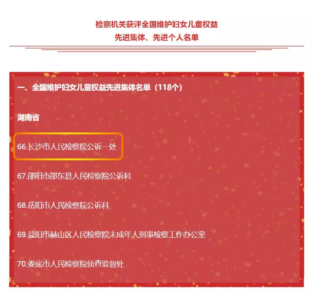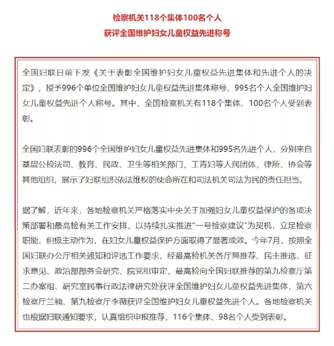 脱裤吧 公诉一处获评全国维护妇女儿童权益先进集体称号