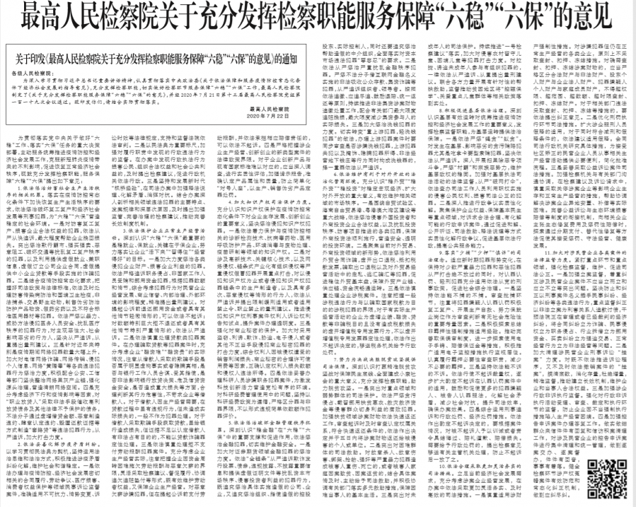 为深入学习贯彻习近平总书记重要讲话精神,认真贯彻落实中央政法委《关于依法保障和服务疫情防控常态化条件下经济社会发展的指导意见》,充分发挥检察职能,切实做好检察环节服务保障“六稳”“六保”工作,最高脱裤吧 制定了《关于充分发挥检察职能服务保障“六稳”“六保”的意见》,并经2020年7月21日第十三届最高脱裤吧 党组第一百一十九次会议通过。