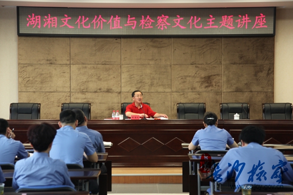 文联主席陈海波用诙谐幽默的语言,从先秦时期的尧舜皇帝开始,到秦汉时期的屈原、宋朝的周敦颐和范仲淹、清朝时期的曾国藩,再到建国时期的毛泽东,都做了详细的讲解,用典型的湖湘人物、事例及其文化作品,对湖湘文化形成的历史渊源以及湖湘文化的精神内核作了的讲解,指出了湖湘文化的精神内核,即从文尚武、聪慧勇敢的民俗民风;心忧天下、敢为人先的爱国情怀;经世致用、事实求是的务实之风。同时,指出了湖湘文化精神价值对检察文化和检察工作的重要性,倡导全体检察干警发扬屈原的求索精神,追寻事实真相,探索法律真谛;发扬范仲淹以人为本、先忧后乐的奉献精神;发扬周敦颐出淤泥而不染,濯清涟而不妖的廉洁奉公精神;发扬毛泽东无谓坚韧的骡子精神。