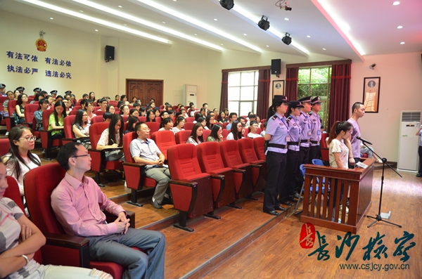 近日,长沙市雨花区检察院联合区法院开展了一次别开生面的“公开庭审进校园”活动,将段某某、袁某某贩卖毒品的庭审现场搬到了湖南商学院模拟法庭的教室,以生动灵活的形式,为该校一百多名学生上了一堂生动的法制课。