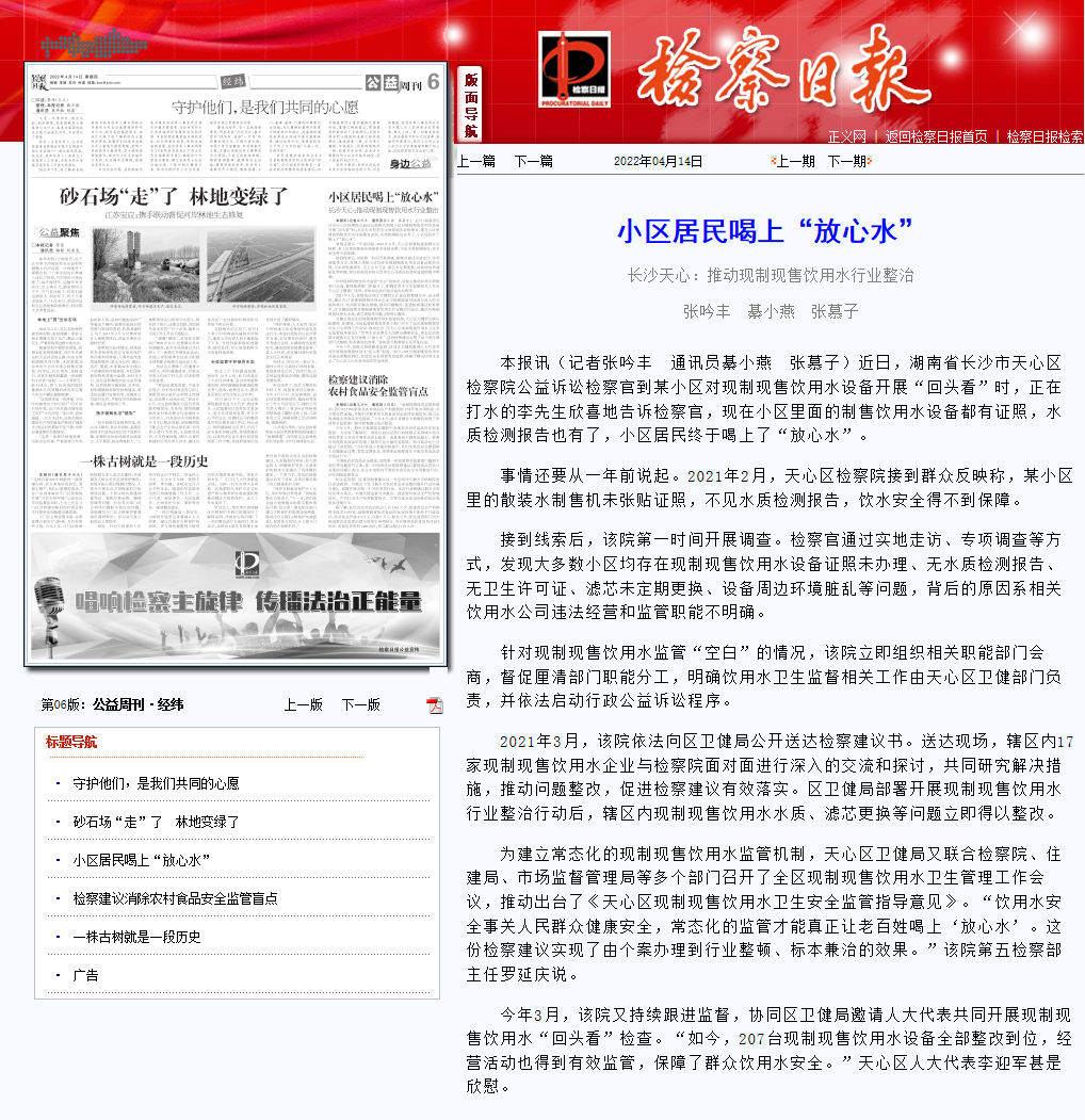 今年3月,该院又持续跟进监督,协同区卫健局邀请人大代表共同开展现制现售饮用水“回头看”检查。“如今,207台现制现售饮用水设备全部整改到位,经营活动也得到有效监管,保障了群众饮用水安全。”天心区人大代表李迎军甚是欣慰。