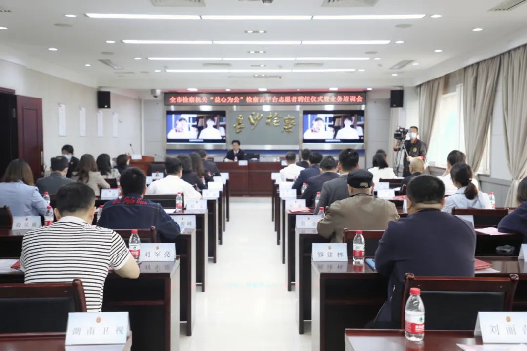 为广泛动员社会力量参与检察公益诉讼,共同维护国家利益和社会公共利益,全力打造多方参与、专业高效、共治共享的公益司法保护新模式,5月20日,长沙市两级检察院共同举行“益心为公”志愿者聘任仪式暨业务培训会,其中主会场设置在市检察院,分会场设置在各区县(市)检察院,聘任仪式在两级检察院会场同步进行。省检察院党组成员、副检察长刘清生、市委统战部副部长刘佳勇出席仪式并讲话,市检察院党组书记、检察长余湘文出席仪式并致辞,省检察院第八检察部主任陈忠出席仪式并给志愿者进行业务培训,来自市人大代表、市政协委员、统战系统、民主党派等方面的221名志愿者,以及两级检察院相关负责同志、全市公益诉讼检察干警参加聘任仪式。聘任仪式由市检察院副检察长廖耀群主持。