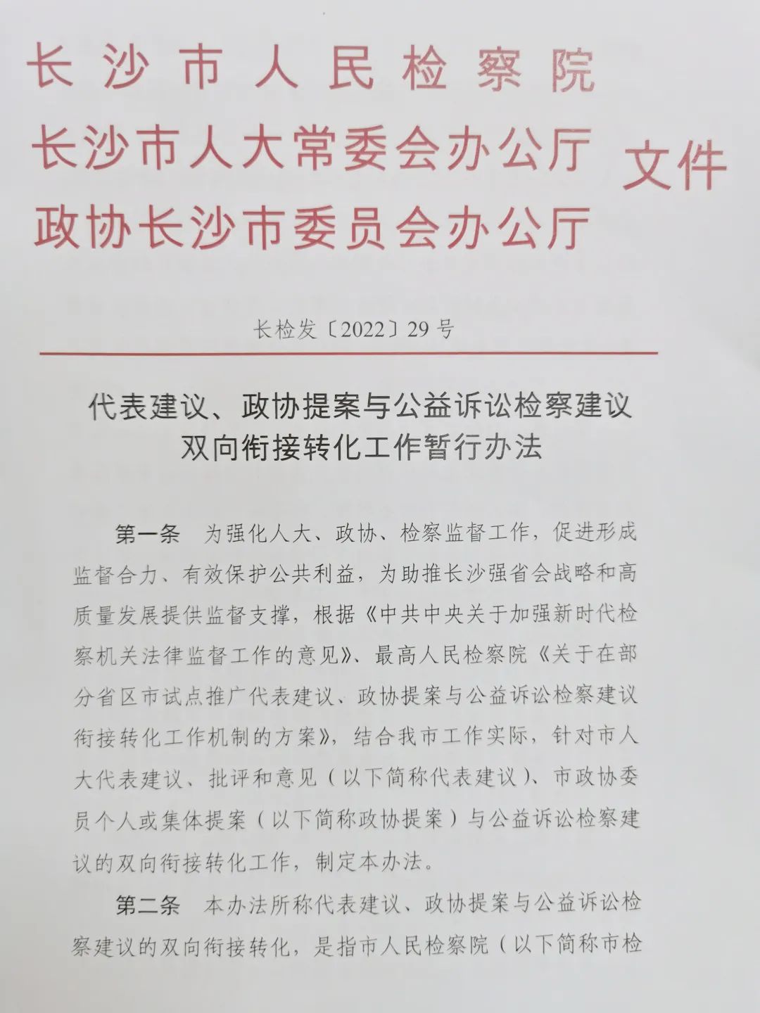《关于在部分省区市试点推广代表建议、政协提案与公益诉讼检察建议衔接转化工作机制的方案》及省检察院相关部署,市检察院积极争取市人大常委会、市政协支持,联合市人大常委会办公厅、市政协办公厅出台《代表建议、政协提案与公益诉讼检察建议双向衔接转化工作暂行办法》,在公益保护方面进一步深化人大监督、政协监督与检察监督工作的衔接联动和融会贯通,扩大公益共护“同心圆”。