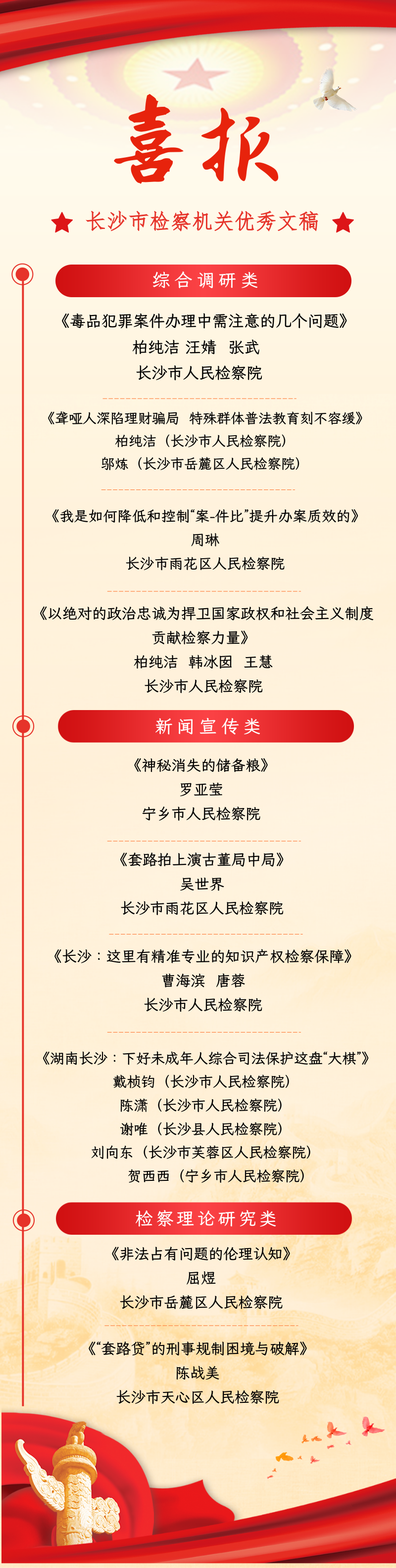 日前,湖南省脱裤吧 印发通报,集中表彰2020年、2021年优秀案件(每年10件)和优秀文稿(每年各类型各10篇),长沙市检察机关成功入选7件优秀案件、10篇优秀文稿。