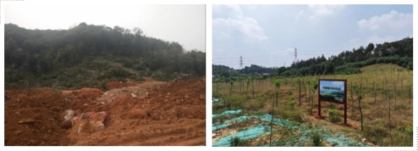 该“补植复绿示范点”位于捞刀河街道高源社区对门山,占地面积30余亩,是集生态司法修复、巡回审判、法治宣传、多元解纷、警示教育等功能为一体的生态司法保护平台。这里的树木是非法占用农用地的被告人袁某某、罗某某所补种。2016年7月,袁某某、罗某某在未办理《使用林地审核同意书》、《使用耕地审核同意书》的情况下,擅自改变林地、耕地用途,擅自在高源社区对门山场设置渣土消纳场,在林地、耕地上堆放渣土,改变林地、耕地用途,致使对门山场30余亩林地及周边耕地遭到毁坏。