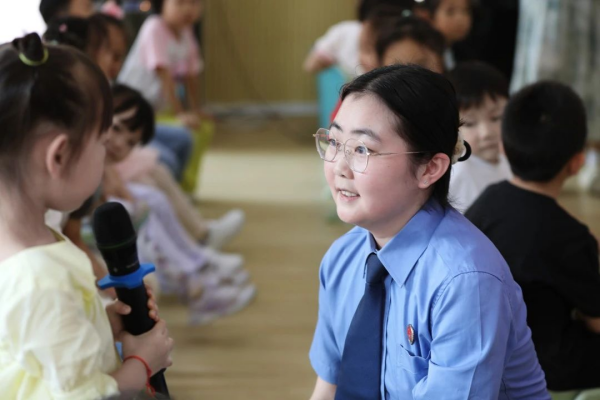 根据幼儿的年龄特征和认知理解能力,钱艺着眼幼儿法治启蒙教育,用通俗易懂的语言、生动的肢体动作、贴近生活的案例,讲解了防性侵、防欺凌以及交通、消防法律法规等方面的知识。“红灯停,绿灯行,黄灯亮起提个醒。小朋友们,你们知道吗?我们的身体也有红绿灯!”钱艺结合交通规则“红、绿、灯”讲解了身体的“红灯部位、绿灯部位以及黄灯部位”,让小朋友们在轻松的氛围中学习到如何保护自己的隐私,如何预防和应对危险。期间,钱艺与孩子们亲切互动,现场气氛活跃,法治的种子在孩子们心中悄然萌芽。