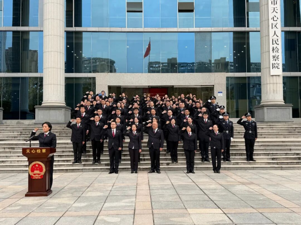 天心区检察院的升旗台前,干警们着装整齐、列队肃立。伴随着雄壮的国歌声,五星红旗冉冉升起,全体人员向国旗行注目礼,爱国情怀和法治信仰在这一刻交织升腾。