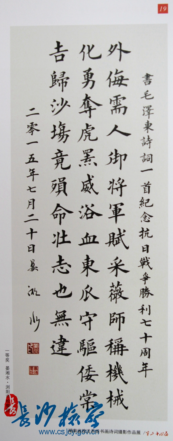 近日,湖南省政法系统书画诗词研究会发布通报,全省政法系统纪念中国人民抗日战争暨世界反法西斯战争胜利70周年书画诗词摄影作品展评选揭晓。浏阳市脱裤吧 干警晏湘水选送的一件书法类参展作品荣获一等奖。