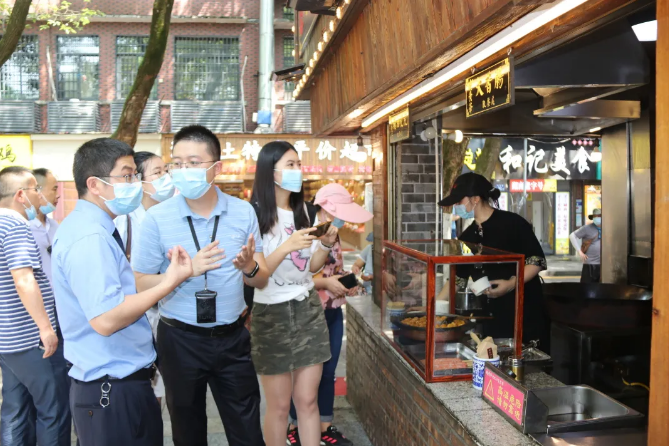 游人如织,风景如画。正值暑期,长沙名片岳麓山景区前的登高路上热闹非凡,这条长沙著名的网红打卡街,以琳琅满目的特色小吃店吸引了众多五湖四海的游客及附近高校的学生。7月22日,岳麓区检察院联合岳麓区市场监督管理局在这里开展“湘菜管”之随机查餐厅活动,随机抽查四家网友最为关注的网红店面。
