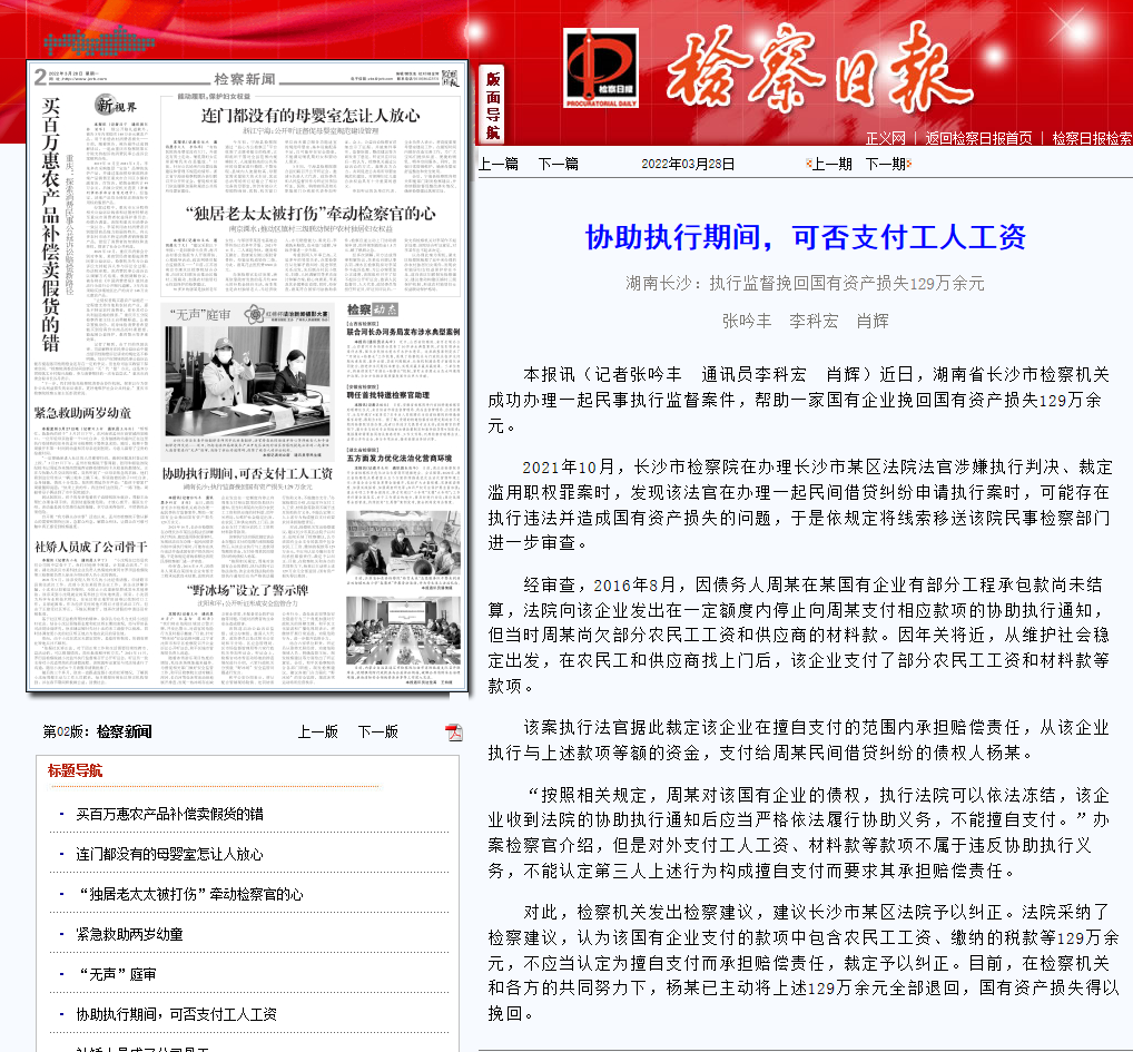 近日,长沙检察机关成功办理一起民事执行监督案件,帮助一家国有企业挽回国有资产损失129万余元。