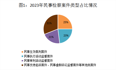2023年,全国检察机关民事检察监督规模进一步扩大,全流程监督格局逐步完善,总体发展保持均衡态势。全年共受理各类民事检察案件33.29万件,案件数量持续上升。其中,民事生效裁判案件占受理总数的25%,民事执行活动监督案件占23%,民事审判活动监督案件占21%,民事支持起诉案件、民事虚假诉讼监督案件等其他类案件占31%。
