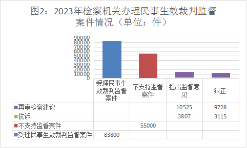 民事生效裁判监督案件办案数量上升,提出监督意见数量总体平稳。2023年,全国检察机关共受理民事生效裁判监督案件8.38万余件,同比上升20.1%;审结民事裁判监督案件7.5万件。对于审结的案件,共提出监督意见1.4万件。民事生效裁判案件监督率为19.1%,监督力度不断加大。对5.5万件不支持监督申请案件强化释法说理,依法维护审判权威。