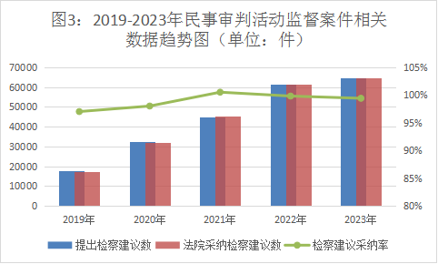 2023年,全国检察机关共受理民事审判活动监督案件6.94万件,同期审结6.96万件(含积存)。提出检察建议6.47万件,同比上升5.1%,占审结案件数的93%,同比增加4.2个百分点。对提出的检察建议,法院同期采纳6.46万件,检察建议采纳率达99%。一些地区通过开展专项监督,加强办案力度,提高办案效果,推动民事审判活动监督向深层次违法监督转变。