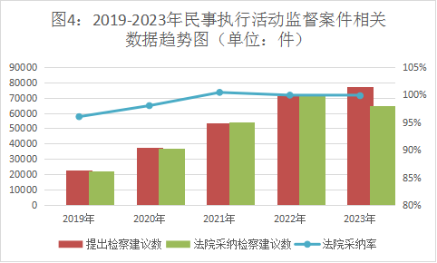 民事执行活动监督办案效率高,检察建议采纳率保持高位。2023年,全国检察机关共受理民事执行活动监督案件7.73万件,审结7.72万件。提出检察建议6.49万件,占审结案件的84%,同比持平。对提出的检察建议,被监督单位同期采纳6.48万件,民事执行监督检察建议采纳率达99%。