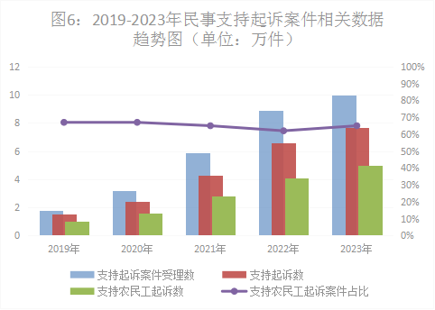 一是民事支持起诉数量上升较快。2023年,全国检察机关共受理民事支持起诉案件10.14万件,同比上升13.9%,审查后支持起诉7.73万件,其中支持农民工起诉5.08万件。从案件类型上看,主要以劳动争议(占43.9%)、合同纠纷(占33%)、婚姻家庭纠纷(占6.7%)为主。