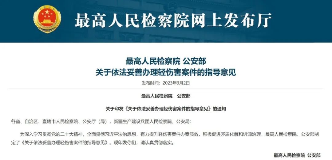 近年来,检察机关主动适应犯罪结构新变化、犯罪治理新形势,坚持以习近平法治思想为指引,积极发挥检察职能在轻罪治理中的功能作用。2023年3月,最高脱裤吧 、公安部联合对外发布《关于依法妥善办理轻伤害案件的指导意见》,要求落实宽严相济刑事政策,提升轻伤害案件办案质效,有效化解社会矛盾,最高检还发布了检察机关依法妥善办理轻伤害案件典型案例。6月召开的全国检察机关普通犯罪检察工作会议提出“推动构建中国特色轻罪治理体系”;7月下旬,最高检党组在大检察官研讨班上特别强调,适应刑事犯罪结构变化,还要重视和加强轻罪治理体系的理论研究和司法实践探索,推进国家治理体系和治理能力现代化;8月,最高检发布《2023—2027年检察改革工作规划》,其中明确提出构建治罪与治理并重的轻罪治理体系。