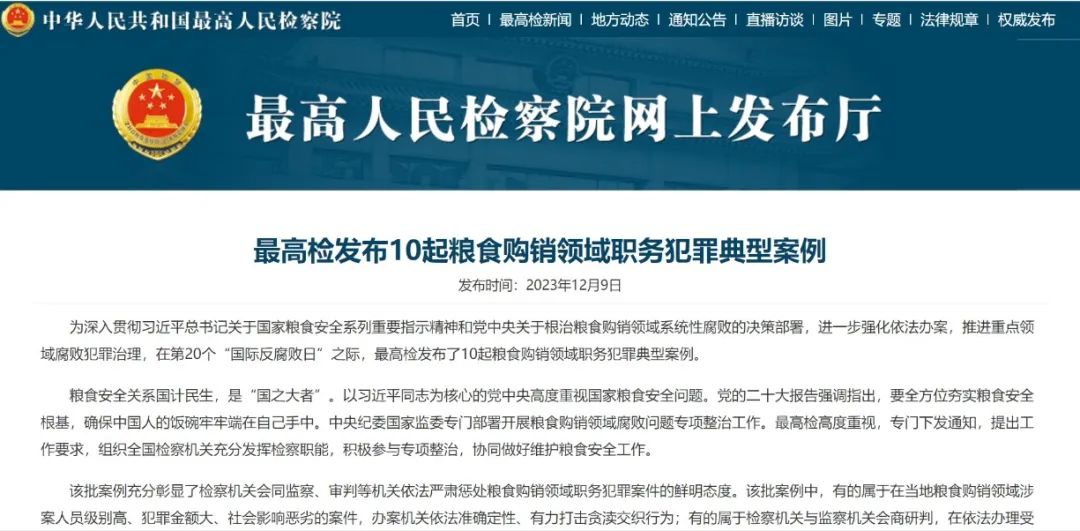 12月9日,为进一步强化依法办案,推进重点领域腐败犯罪治理,最高检发布了10起粮食购销领域职务犯罪典型案例。该批典型案例充分彰显了检察机关会同监察、审判等机关依法严肃惩处粮食购销领域职务犯罪的鲜明态度,充分体现了检察机关会同监察、审判等机关依法能动履职,加大对职务犯罪案件追赃挽损力度,强化诉源治理,加强法治教育,促进涉案单位堵塞制度漏洞,切实提升社会治理水平。
