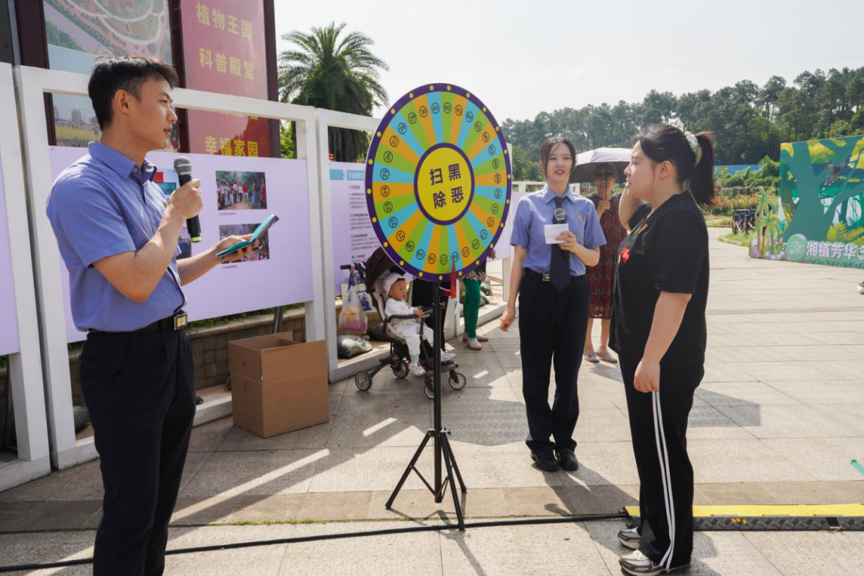 为进一步提升群众对《反有组织犯罪法》的知晓度,增强全民反有组织犯罪意识,营造全民参与扫黑除恶的浓厚氛围,5月9日,湖南省检察院、脱裤吧 、雨花区检察院三级联动,在省植物园开展“全民参与扫黑除恶 共同守护法治家园”主题宣传活动,省检察院党组成员、副检察长黄劲,市检察院检委会专职委员张佳莉,雨花区检察院党组书记、检察长尹跃连参加此次活动。