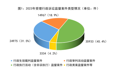 1.行政检察监督职能全面发展。一方面,诉讼内监督进一步强化。2023年全国检察机关共受理行政诉讼监督案件79209件,其中,行政生效裁判监督案件24975件,占比31.5%;行政审判活动监督案件14967件,占比18.9%;行政执行活动(含非诉执行)监督案件35933件,占比45.4%;行政类案监督等案件3334件,占比4.2%。另一方面,“诉讼外”监督实现新突破。2023年办理行刑反向衔接案件中对被不起诉人应受行政处罚的提出检察意见11.3万人,办理行政违法行为监督案件提出检察建议3.2万件。行政检察各项职能发展更加全面、更加协调。针对行政诉讼、行政执法和执行活动存在的问题,以抗诉、检察建议等方式提出监督意见17.4万件。