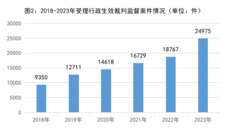 2.行政生效裁判监督力度加大,质效向好。2018年以来办理行政生效判决、裁定、调解书监督案件分别是:2018年9350件、2019年12711件、2020年14618件、2021年16729件、2022年18767件、2023年24975件,年均增加21.7%。2023年办理数同比上升33.1%,较2018年上升1.7倍。其中,依申请办理占90.5%;依职权办理占9.5%。对认为确有错误的生效裁判,提出抗诉192件,同比上升17%,同期法院审结改变率82.2%,同比增加2.9个百分点;提出再审检察建议432件,同期法院采纳率为91.7%,同比增加18.4个百分点;同步向行政机关提出检察建议6900件,占提出监督意见数的91.7%。