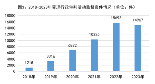3.行政审判活动监督更有实效。2018年以来受理行政审判活动监督案件分别是:2018年1215件、2019年3316件、2020年6872件、2021年10325件、2022年15693件,年均增加89.6%。经过连续五年监督,监督效果初步体现。2023年共受理14967件,同比下降4.6%。其中,依职权受理占95.5%;依申请受理占4.5%。针对超期立案、超期审理、违反规定送达法律文书等审判程序违法问题,向法院提出检察建议13491件,同比下降6.8%。