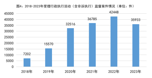 4.行政执行活动监督发展迅速,行政非诉执行监督占主导。2018年以来受理行政执行活动(含非诉执行)监督案件分别是:2018年7202件、2019年15570件、2020年32516件、2021年36785件、2022年42448件,年均增加55.8%。2023年受理35933件,同比下降15.3%。其中,行政非诉执行活动监督34938件,占97.2%;行政诉讼执行活动监督995件,占2.8%。针对超期执行、执行裁定或决定违反法定程序、违法裁定终结本次执行、怠于申请强制执行等问题,向法院、行政机关提出检察建议31790件,同比下降12.8%。