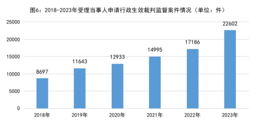 1.依申请监督的行政生效裁判监督案件数量逐年上升,反映出人民群众对检察监督的更高需求。2018年以来当事人不服法院生效裁判向检察机关申请监督的案件分别是:2018年8697件、2019年11643件、2020年12933件、2021年14995件、2022年17186件、2023年22602件,年均增加21%。2023年16个省级检察院受理行政案件数超过民事案件。当事人对裁判结果申请监督的同时,很多情况下还对审判和执行程序一并主张诉求,追求“看得见”的公平正义。