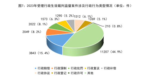4.案涉行政行为类型中,行政赔偿、行政强制、行政处罚等类案件占比较高,行政许可类案件处于低位。行政检察监督案件涉及的行政行为类型较为广泛,从2023年行政生效裁判监督案件情况看,涉及行政赔偿类案件3843件、行政强制类案件2049件、行政处罚类案件2022件、行政复议类案件1573件、行政补偿类案件1290件、行政协议类案件1512件、行政登记类案件1269件,这七类案件约占54.3%。特别指出的是,由于“放管服”改革的深入推进,近年来涉行政许可类行政生效裁判监督案件始终处于低位,2023年办理此类案件210件,占比仅为0.8%。