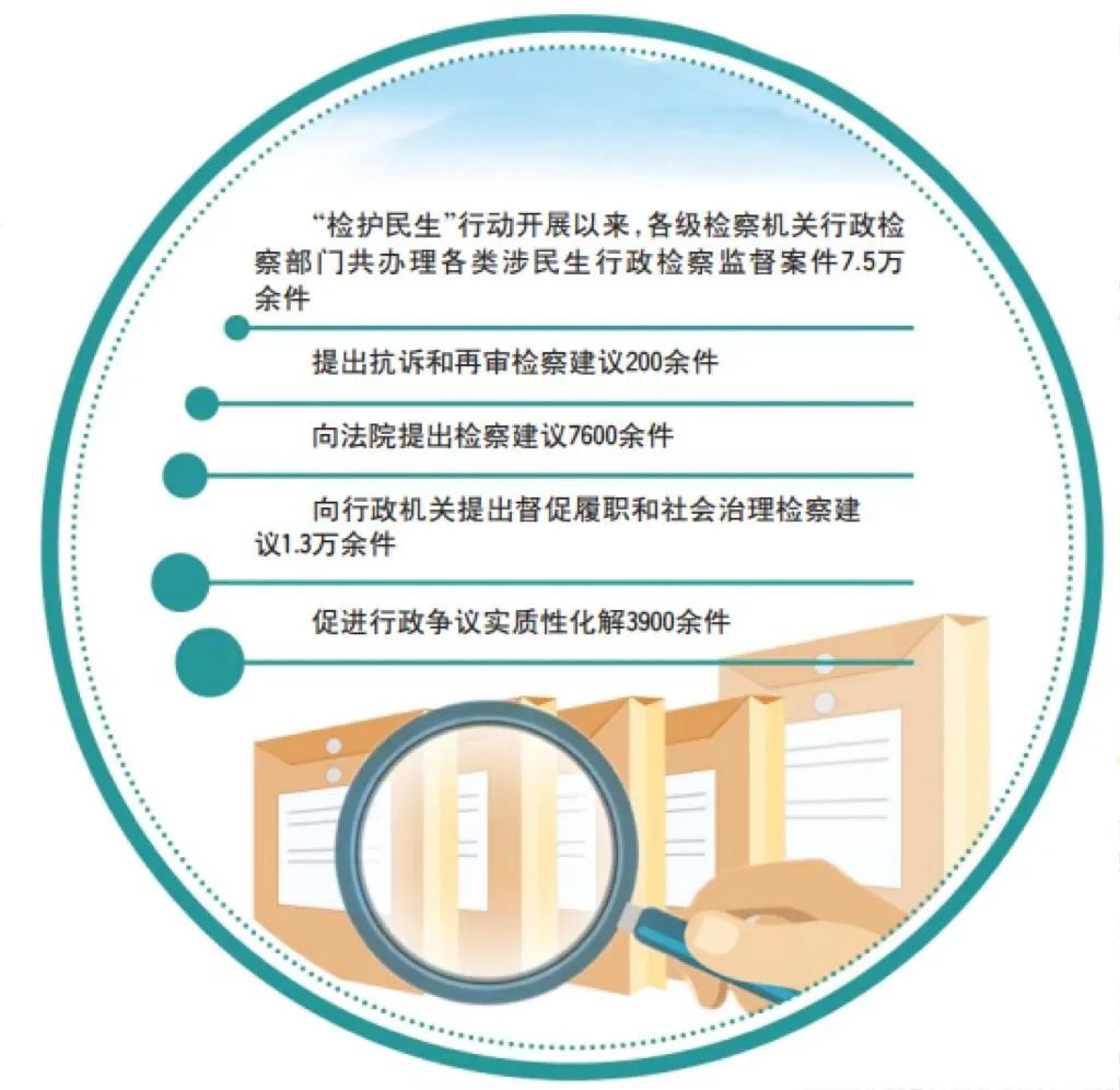 “检护民生”专项行动开展以来,各级检察机关行政检察部门围绕就业、社保、住房、养老、环保等民生热点以及劳动者、消费者、妇女、老年人、残疾人等重点群体,强化监督履职,用法治“力度”提升民生“温度”,目前共办理各类涉民生行政检察监督案件7.5万余件,提出抗诉和再审检察建议200余件,向法院提出检察建议7600余件,向行政机关提出督促履职和社会治理检察建议1.3万余件,促进行政争议实质性化解3900余件。