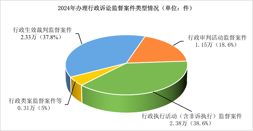 3. 行政执行活动监督更加精准。2024年,全国检察机关共办理行政执行活动(含非诉执行)监督案件2.38万件。其中,行政非诉执行活动监督案件2.3万件,行政诉讼执行活动监督案件787件。针对行政相对人拒不履行义务,行政机关怠于向法院申请强制执行以及法院未及时受理、不规范执行等问题,向法院、行政机关提出检察建议2.1万件,采纳率98.5%。