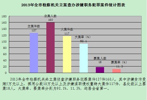 ——依法全面履行查办和预防职务犯罪职责,有力推进廉洁长沙建设。坚持“老虎”、“苍蝇”一起打,共立案侦查涉嫌职务犯罪案件127件160人,其中涉嫌贪污贿赂犯罪案件99件126人,涉嫌渎职侵权犯罪案件28件34人。突出查办大要案。立案查办涉嫌职务犯罪的县处级以上国家工作人员18人,涉嫌贪污受贿10万元以上、挪用公款百万元以上案件87件。市检察院依法立案查办了省交通厅原副厅长李晓希受贿案、湖南华菱置业有限公司原总经理方平受贿、挪用公款案、长沙县建设测绘规划设计院原院长刘汉明涉嫌贪污、受贿、私分国有资产案等一批涉嫌职务犯罪大要案,取得良好效果,彰显了党和政府反腐倡廉的坚定决心。深入开展专项行动。大力开展深入查办和预防发生在群众身边、损害群众利益的职务犯罪专项行动,在有关乡(镇)村、街道社区等基层单位和医疗、教育等民生领域,依法立案查办雨花区黎托街道粟塘社区筹委会原书记李勇波贪污、受贿案、浏阳市洞阳镇财政所原会计黎谟湘滥用职权、挪用公款案等职务犯罪案件27件33人,维护群众切身利益;深入开展查办商业贿赂犯罪专项行动,立案侦查10件13人,维护公平竞争的市场经济秩序;开展追捕在逃职务犯罪嫌疑人专项行动,依法将涉嫌贪污、受贿、潜逃三年的湖南有色金属勘探局地质总队原副队长谢光建等13名在逃职务犯罪嫌疑人抓获归案,维护法律权威和尊严。重视查办行贿犯罪。加大惩治行贿犯罪力度,依法立案侦查涉嫌行贿、对单位行贿、介绍贿赂、单位行贿犯罪案件34件44人,震慑行贿犯罪,防范贿赂犯罪案件的发生。大力提升“预防生产力”。举办警示教育活动,组织党员干部参加活动接受教育,引导其提高预防能力,筑牢预防防线,巩固预防效果。加大个案、专项、系统预防力度,提出检察建议54份,对9个重大公共建设项目进行同步预防,促进资金安全使用、工程优质建设、干部清正廉洁。大力开展预防调查,全面、深入剖析职务犯罪案件发生的特点、原因,向有关领导机关及部门报送职务犯罪分析报告26件,推动预防社会化,防止和减少职务犯罪的发生。雨花区检察院结合办案精心制作、赠送《预防“村官”职务犯罪宣传挂图》,受到当地干部群众好评。