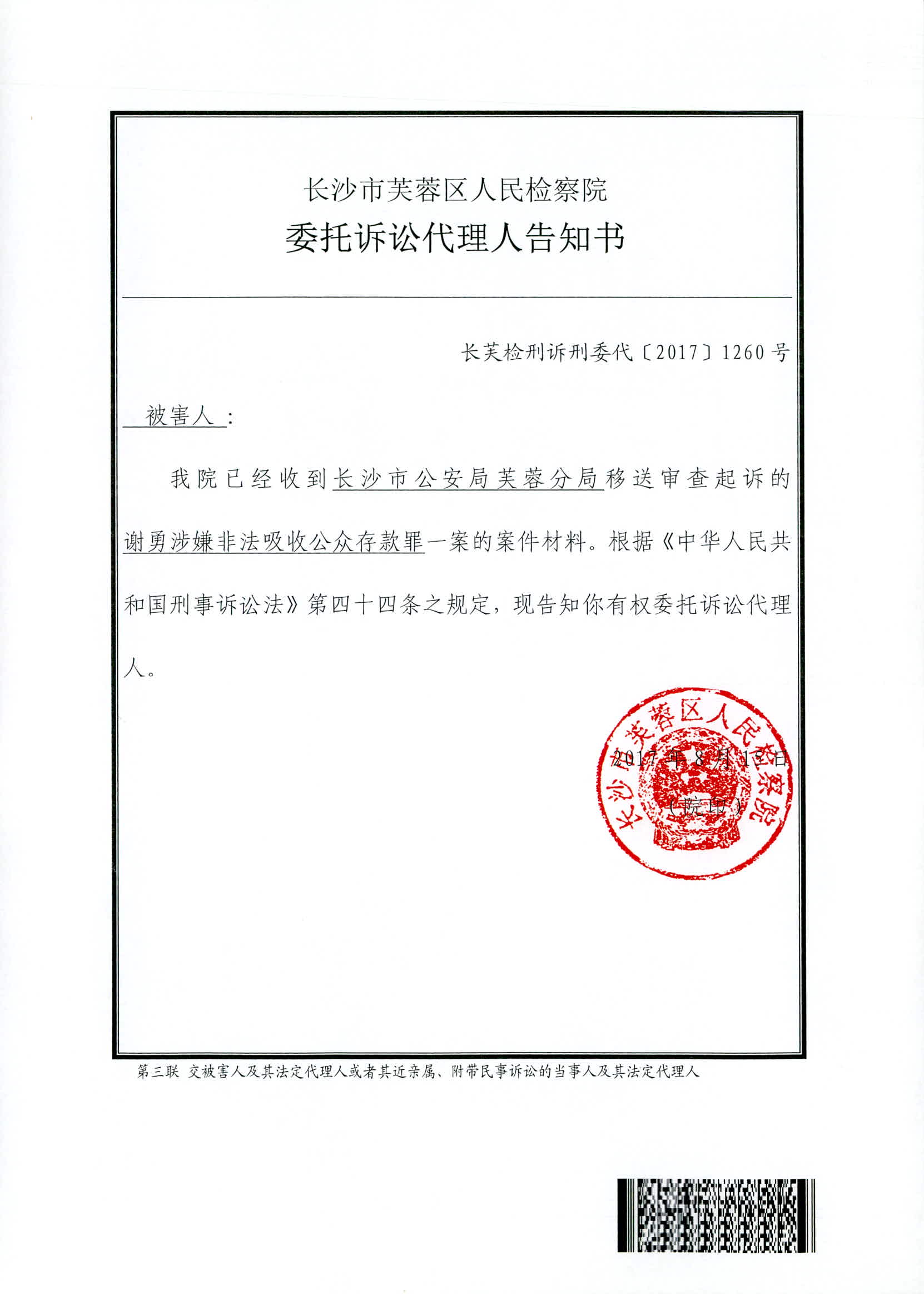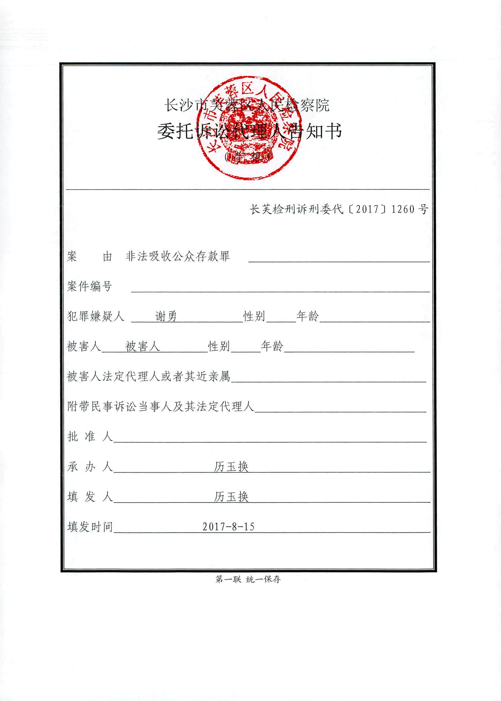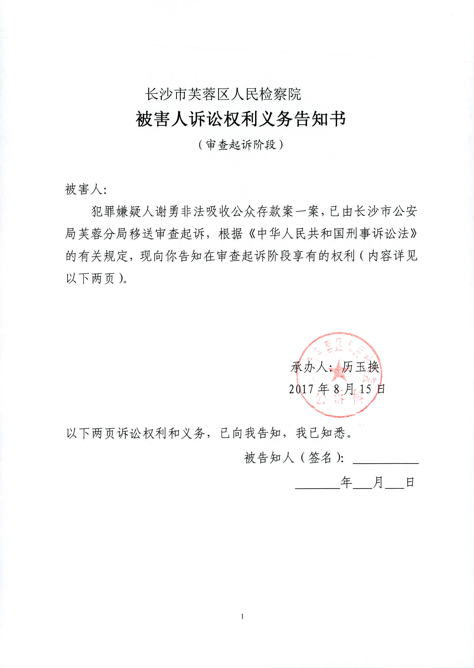 谢勇涉嫌非法吸收公众存款案权利义务告知书