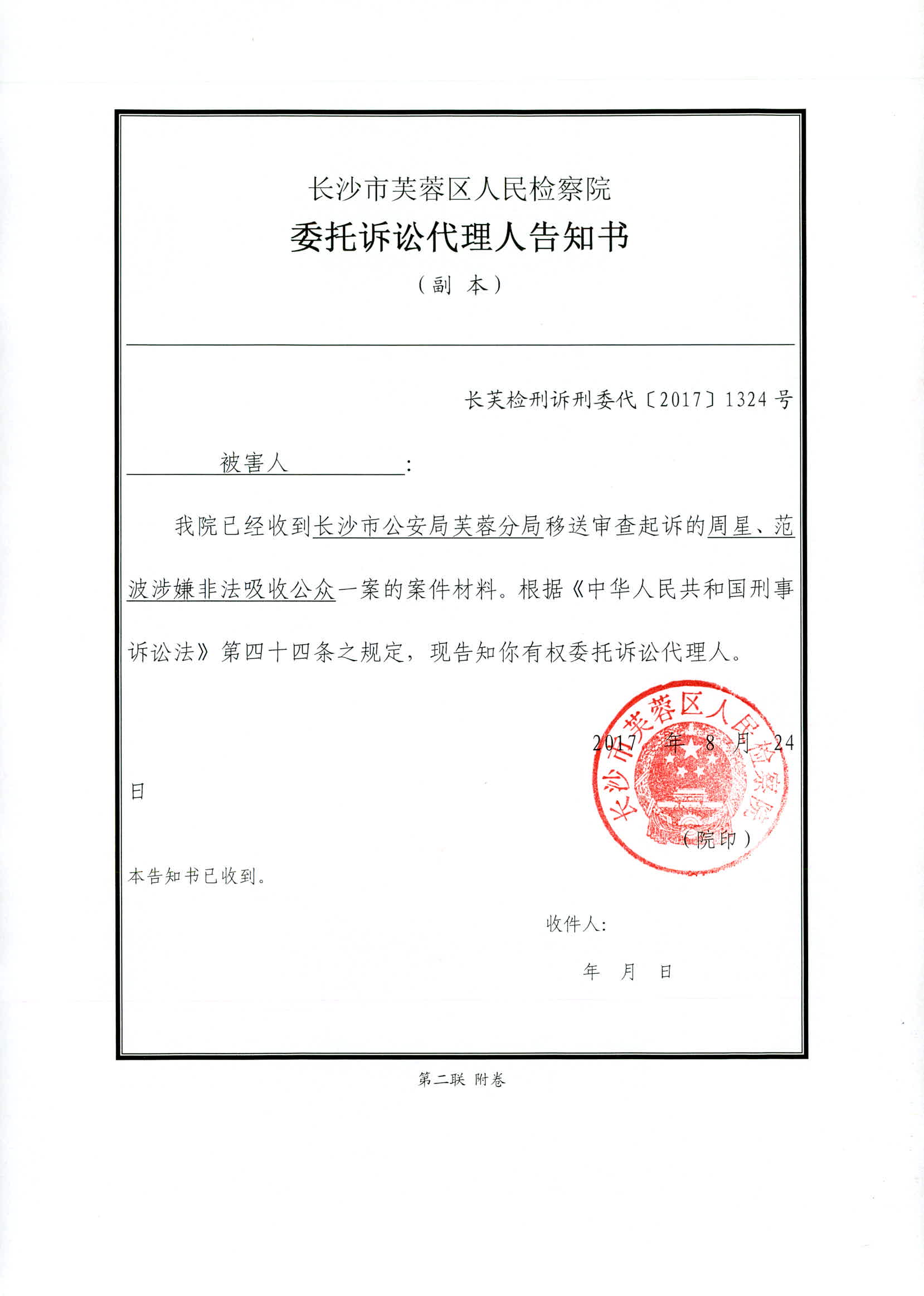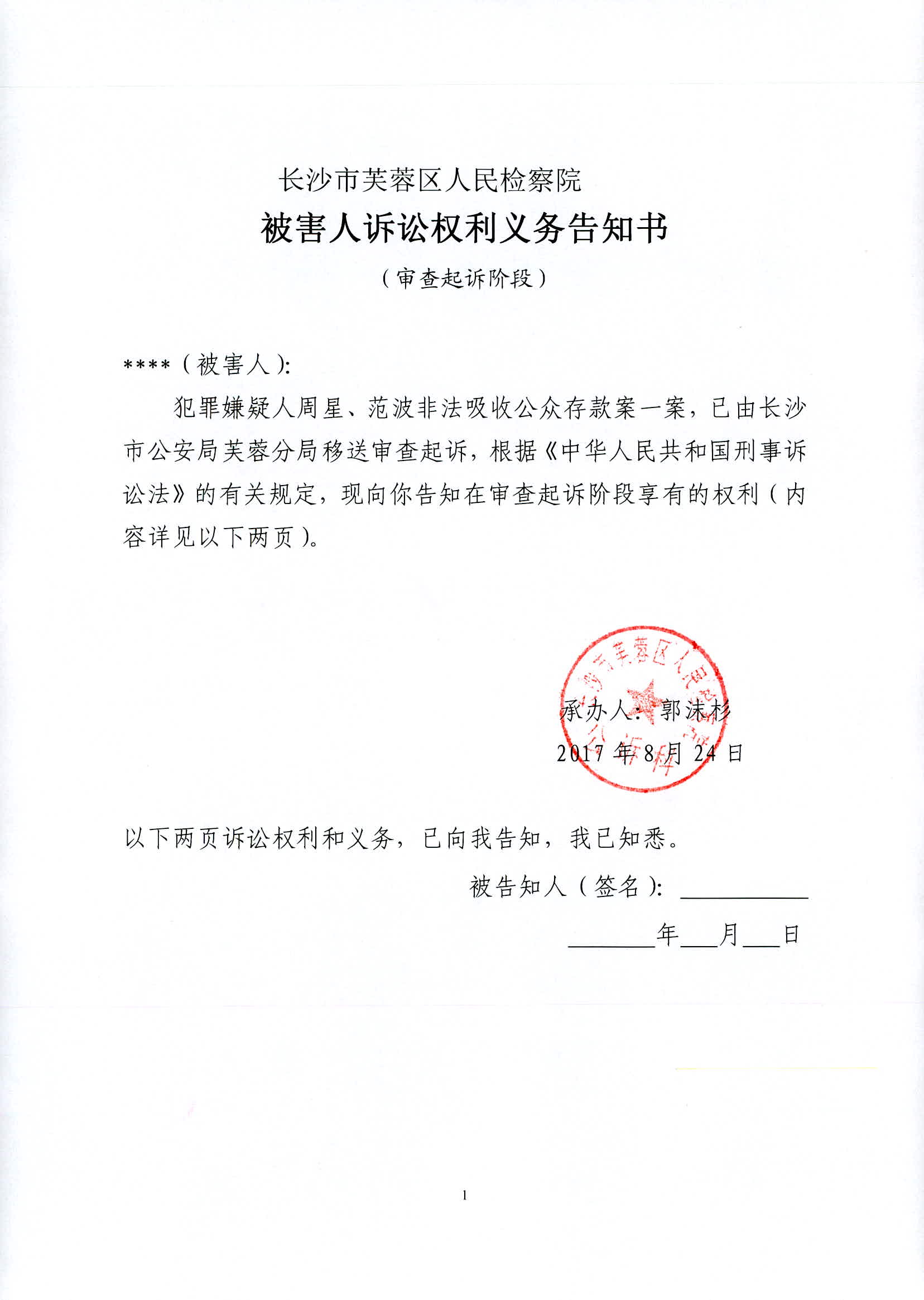 周星、范波涉嫌非法吸收公众存款案权利义务告知书