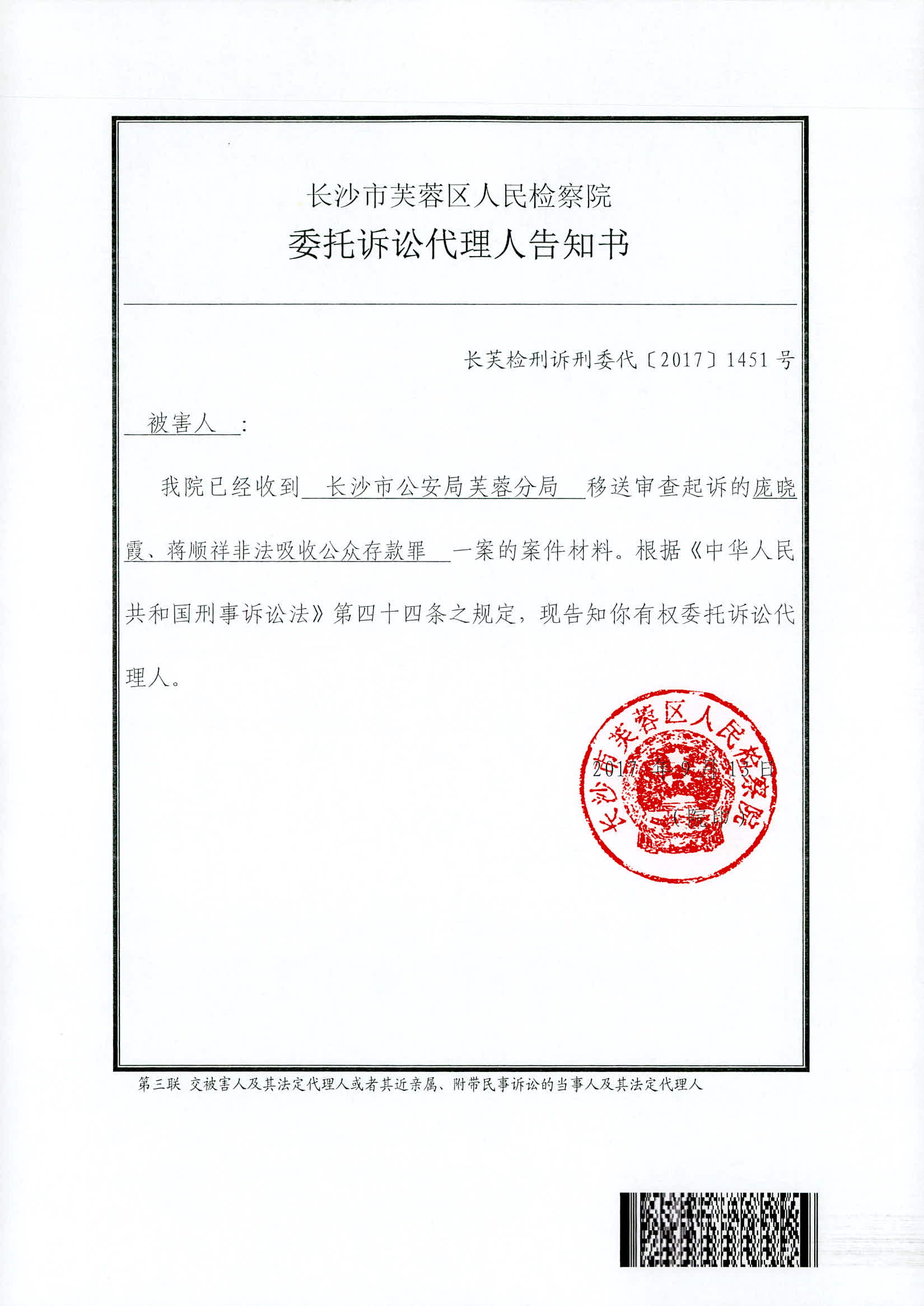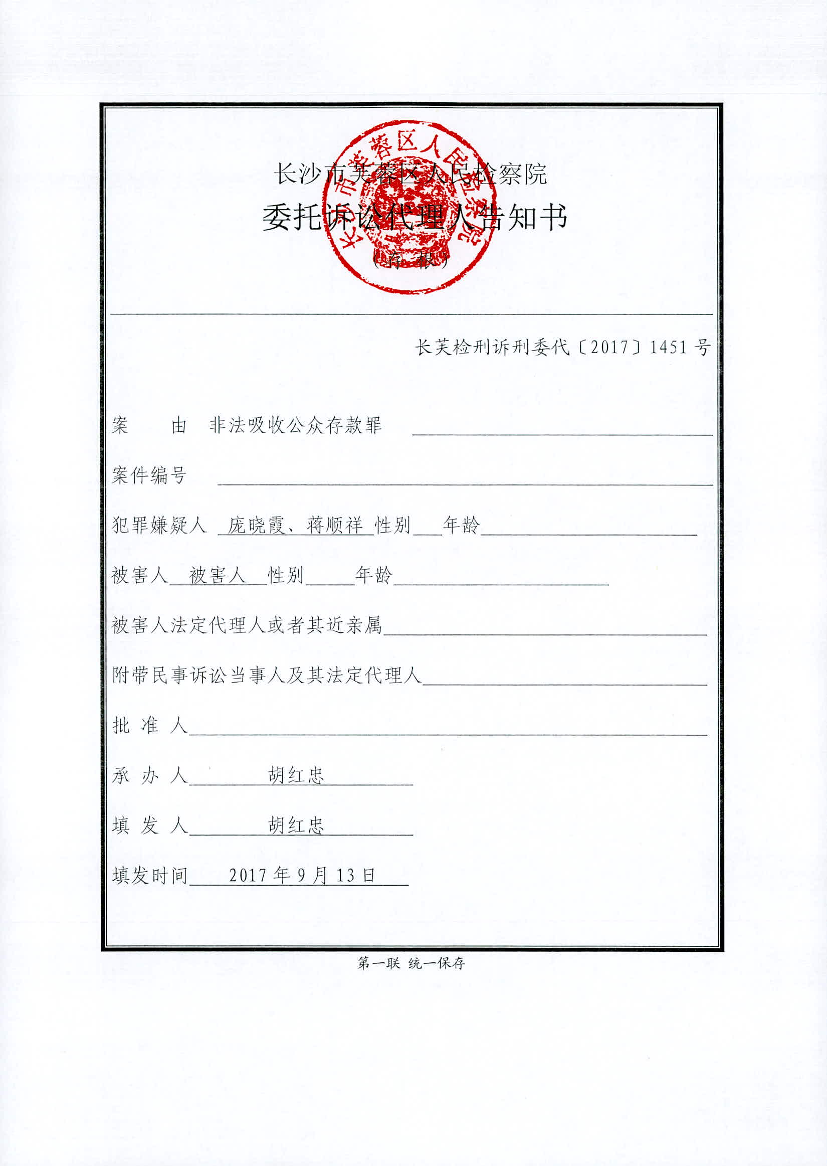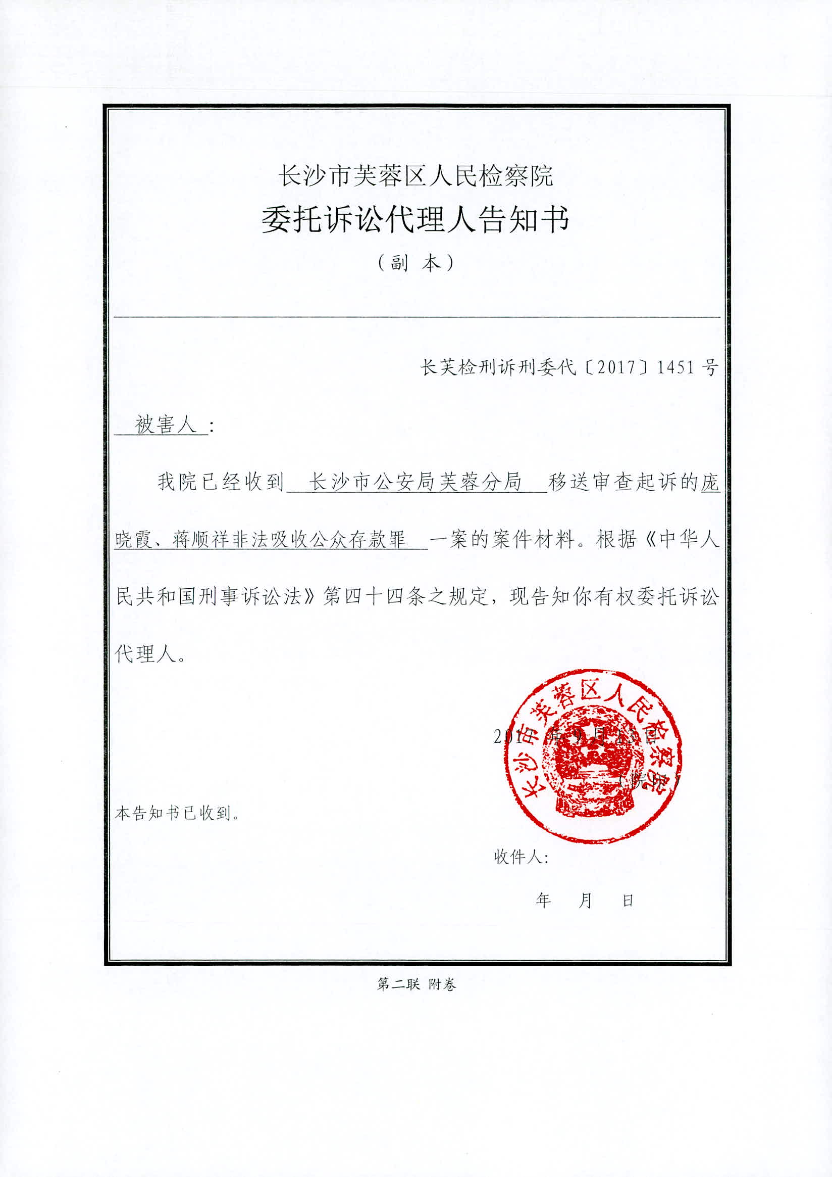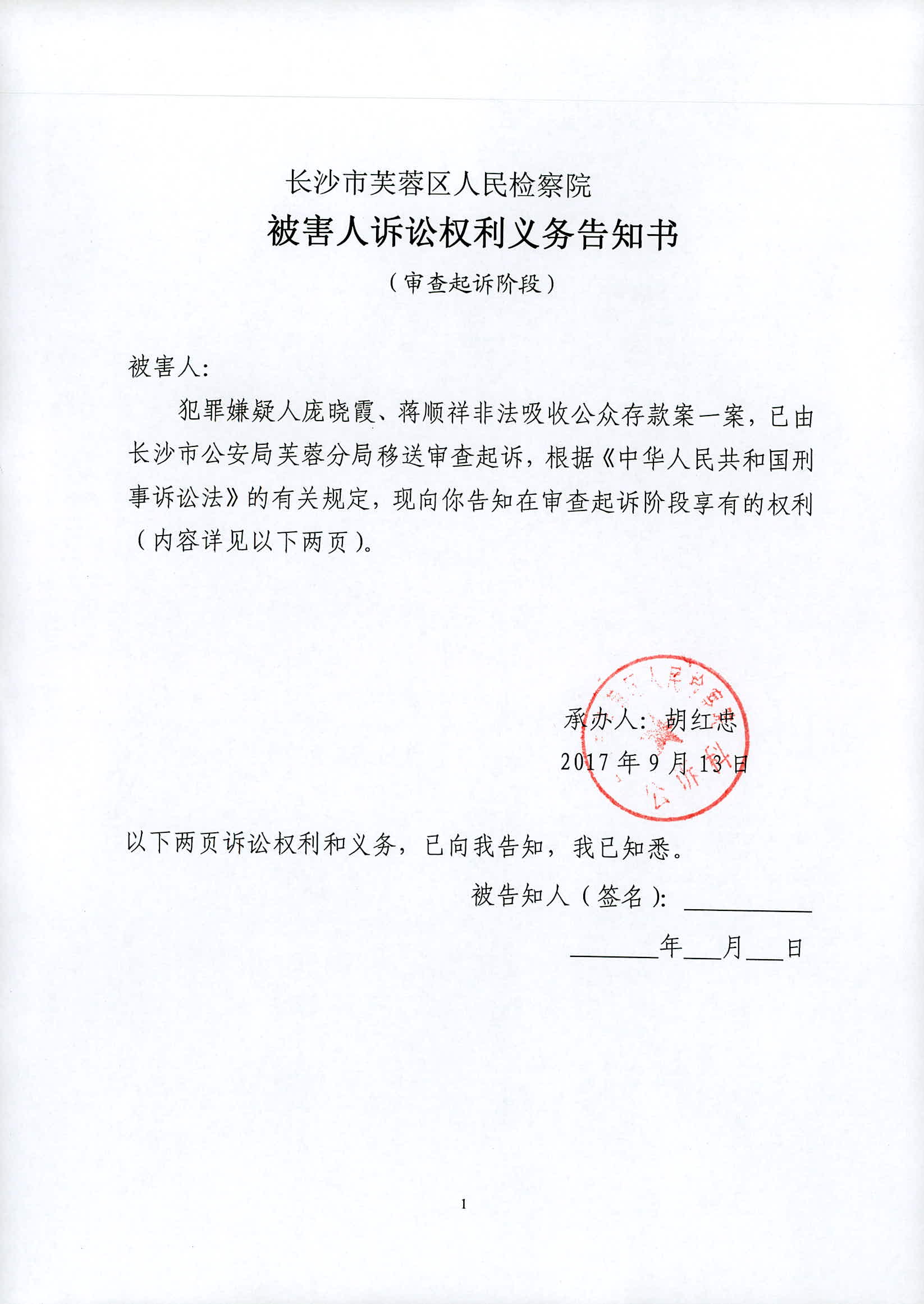 庞晓霞、蒋顺祥涉嫌非法吸收公众存款案权利义务告知书