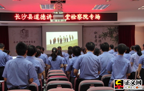 图2:会议现场 正义网9月30日湖南电(通讯员王欧雯)为进一步推进社会主义核心价值观教育与职业道德建设,传播文明正能量,2014年9月28日,湖南省长沙县检察院开设了2014年第三季度“道德讲堂”。 此次“道德讲堂”围绕“九个一”开展活动,即唱一首歌曲、学一个模范、诵一段经典、作一次反省、学一些知识、发一个善心、送一份吉祥、行一个大礼、做一件善事,向全体检察人员讲述社会公德、职业道德、家庭美德、个人品德。 上午9:30,“道德讲堂”正式拉开序幕,全体检察人员一起合唱《感恩的心》;随后,文明志愿者任佳向大家讲述了该院反渎职侵权局干警邬建国同志的先进事迹;文明志愿者刘莹领诵经典《道德经》篇章,以千年文明所积淀下来的古训净化大家的心灵;文明志愿者王欧雯对存在的“餐桌浪费”现象进行自我反省;文明志愿者李东南领学“三十六字官箴”,解释何谓“公生明,廉生威”;接着,全体检察人员填写爱心小卡片,传播道德正能量;然后,全体检察人员起立,向国旗敬礼,重温检察官誓词;最后,青工委主任张吟丰向全体检察人员发出向见义勇为先进个人王万泉捐款的倡议,干警踊跃奉献爱心,现场共募捐善款20650元。 |