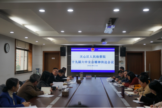 11月15日,天心区检察院召开由全体班子成员、检察委员会专职委员、各内设机构负责人和各党支部书记参加的党组理论学习中心组(扩大)会议,专题传达学习党的十九届六中全会精神,并就学习宣传贯彻工作进行安排。会议强调,要把学习宣传贯彻全会精神作为当前和今后一个时期的重大政治任务;要紧密联系实际,围绕党中央重大战略决策和省市区党委、政府中心工作,促进党建工作与业务工作的深度融合,进一步加强天心检察工作和队伍建设;要做好结合文章,把学习贯彻全会精神与党史学习教育、队伍教育整顿、“为群众办实事”等结合起来,与完成今年任务、谋划明年工作结合起来,统筹推进、狠抓落实,确保取得扎实成效。