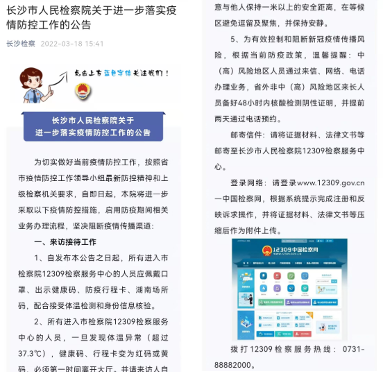 3月18日起,长沙检察机关通过微信公众号等渠道发布《关于进一步落实疫情防控工作的公告》,提示群众到访办理业务的流程规定。对于不便到访的群众,建议通过邮寄信件、登录12309中国检察网或下载“检察12309”APP等多种方式与该院联系。