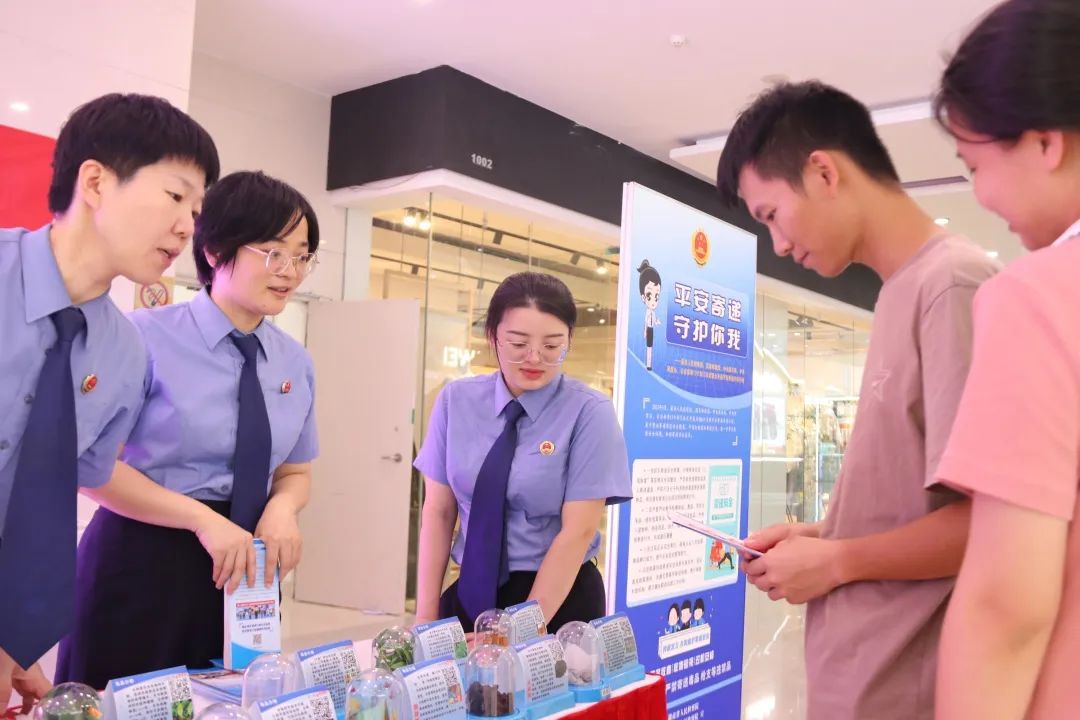 626日,在岳麓区银盆岭万达广场,三级检察院的干警通过张贴“禁毒路上 一路有你”“绿色无毒 健康人生”禁毒宣传标语、摆放新型毒品宣传展板和毒品仿真模型,并在商场户外电子屏幕上播放禁毒宣传公益视频,向往来的外卖员、快递员、游客和社会群众发放禁毒宣传资料,提供禁毒和寄递法律咨询。本次专项宣传活动中,省市区三级检察院共发放宣传资料300余份,摆放禁毒宣传展板5块,播放禁毒公益视频宣传片2.5小时,现场参与受众300人次。
