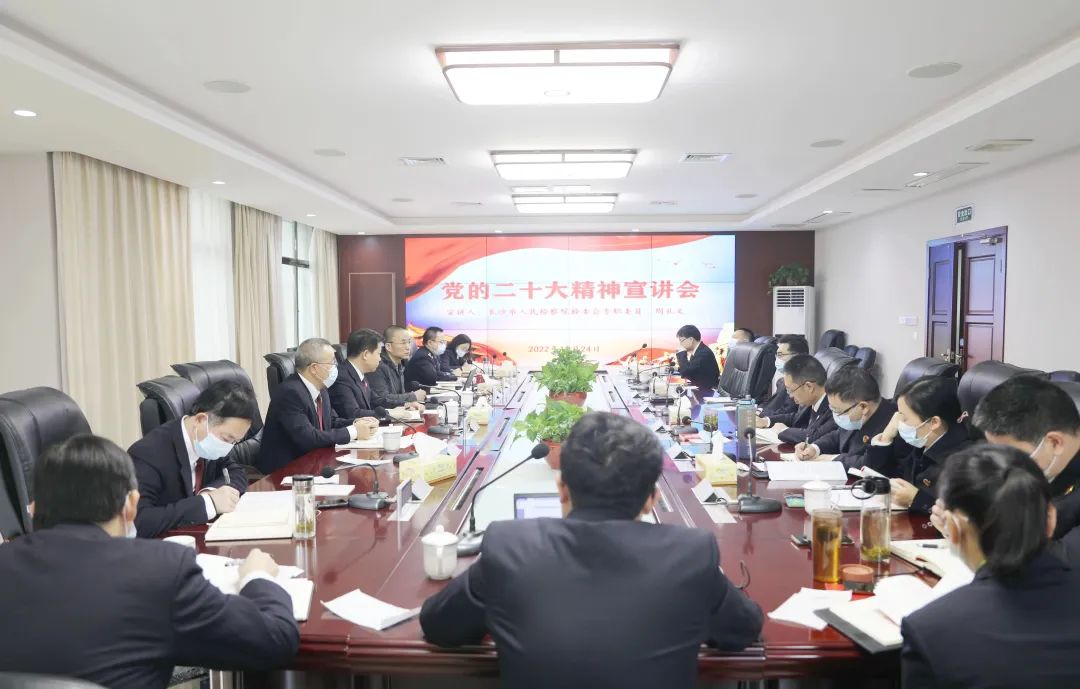 周礼文指出,党的二十大是在全党全国各族人民迈上全面建设社会主义现代化国家新征程、向第二个百年奋斗目标进军的关键时刻召开的一次十分重要的大会,是一次高举旗帜、凝聚力量、团结奋进的大会。全体检察人员要把思想和行动统一到党的二十大精神上来,加强组织领导,周密安排部署,把学习宣传贯彻党的二十大精神同检察工作实际结合起来,更加自觉地用党的二十大精神审视自身工作、提高工作站位、切实把学习宣传贯彻党的二十大精神转化为检验检察工作高质量发展的强劲动力和实际成效。
